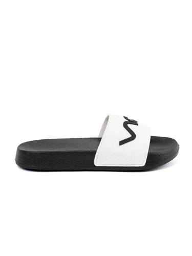Biele šľapky na čiernej platforme zdobené pripináčikmi